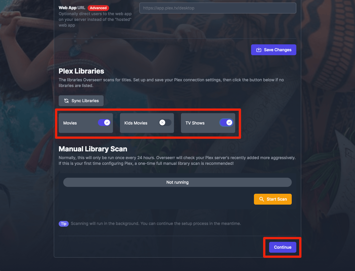 1. Scroll down and flip the switch on the libraries you want to expose for requests and discovery. Click "Continue".