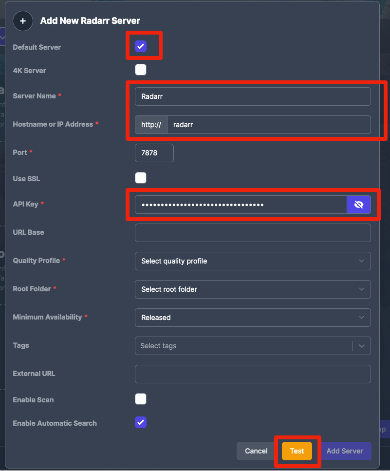 5. Click "Test" to connect to Radarr and retrieve Quality Profiles, etc.