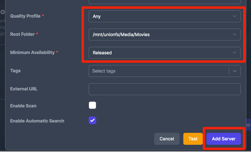 1. Select a Quality, Root Folder, and Minimum Availability, then click "Add Server". This will return you to the screen from the previous step. Click "Add Sonarr Server"