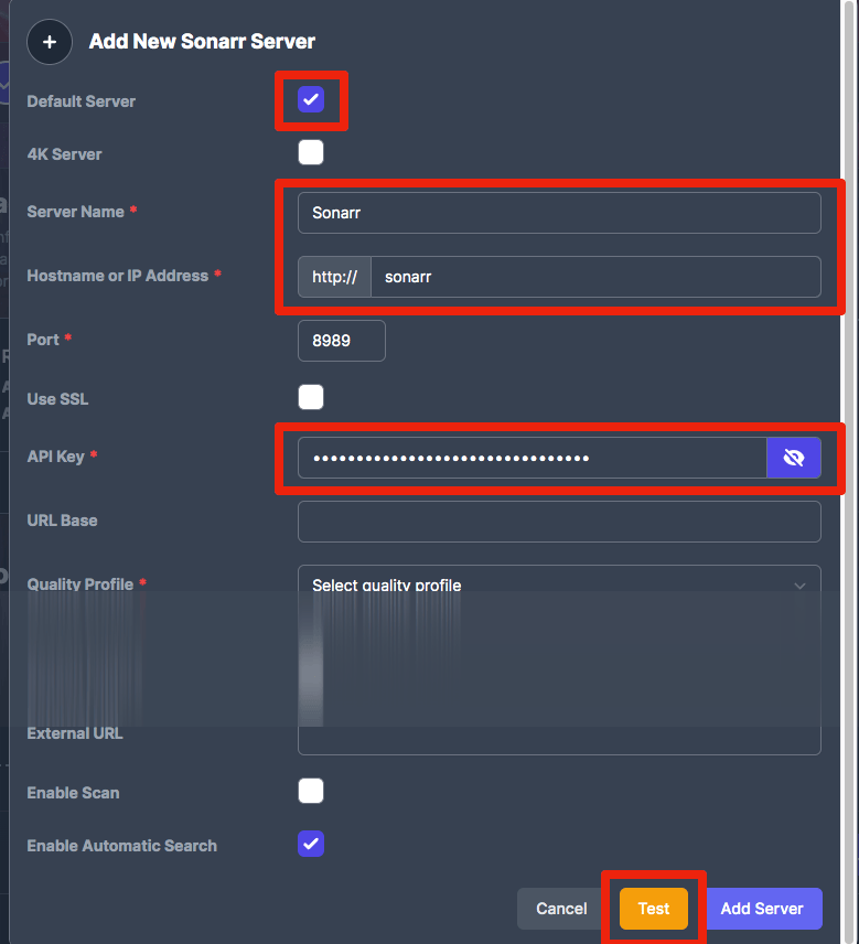 5. Scroll down and click "Test" to connect to Sonarr and retrieve Quality Profiles, etc.