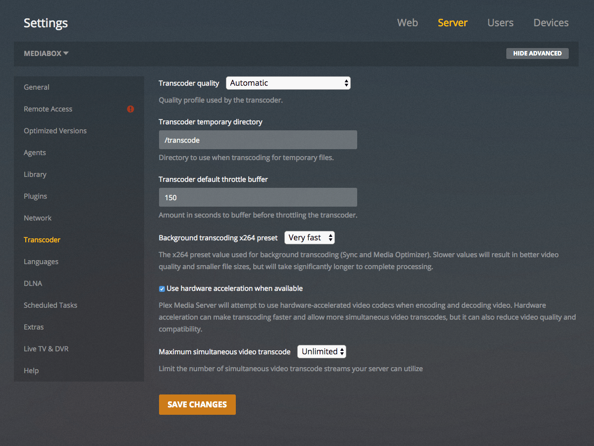 1. Click the Settings icon (top right) → "Server" (top) → "Transcoder" (left).