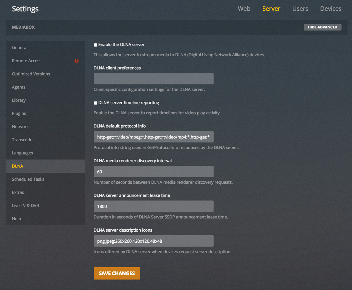 1. Click the Settings icon (top right) → "Server" (top) → "DLNA" (left).
