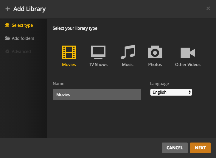 2. In the "Add Library" window, select "Movies" and click "NEXT".