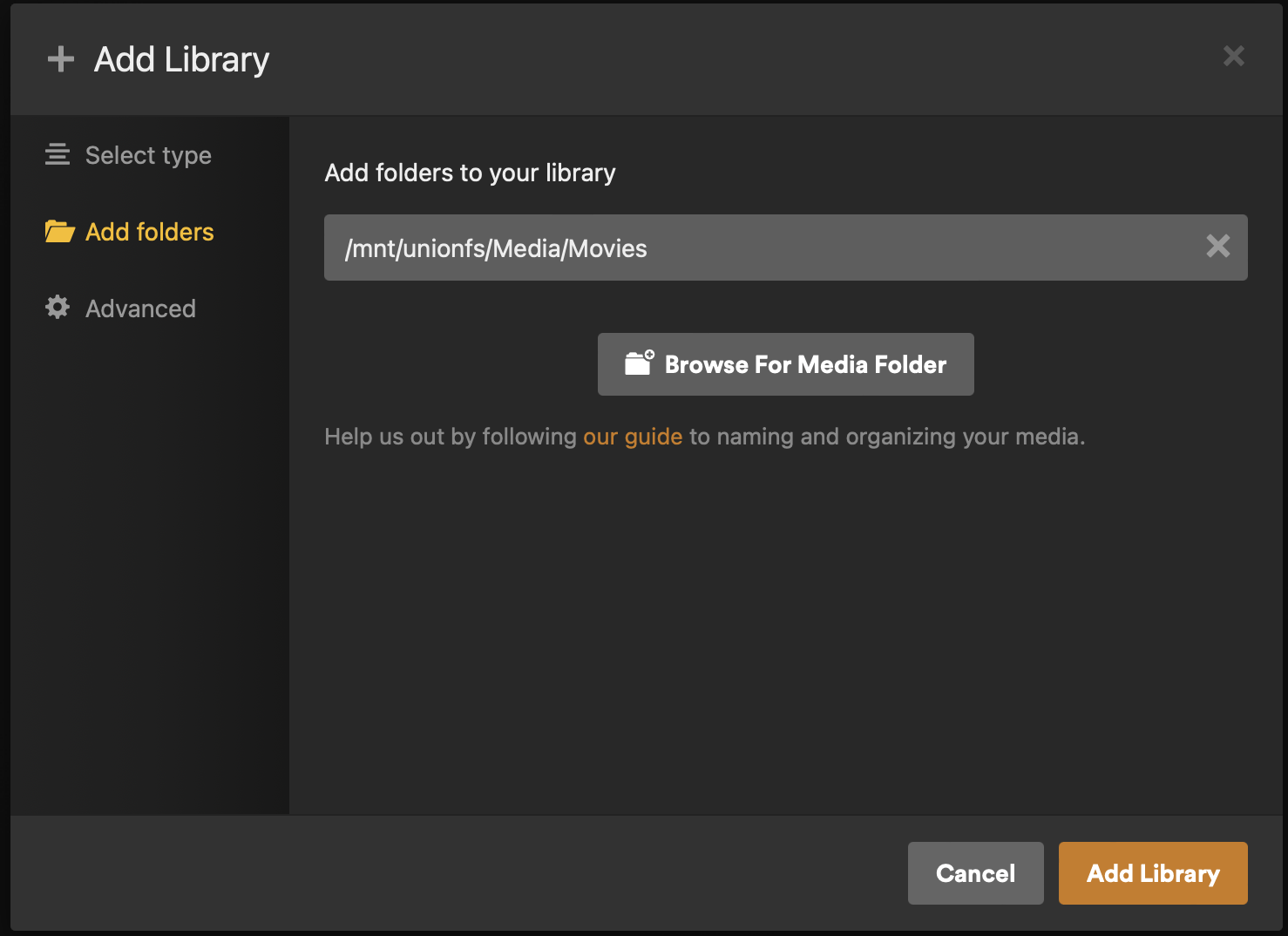 Note: If you would like to have custom Plex libraries (more than just a Movies and TV one), see Customizing Plex Libraries.
