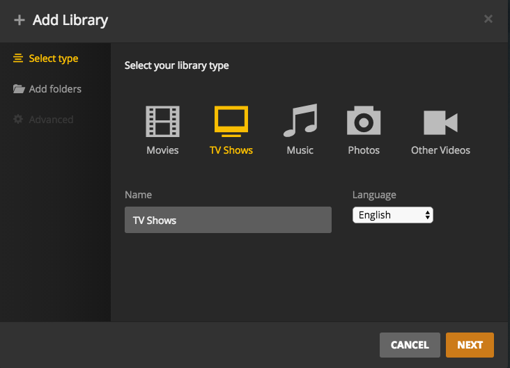 2. In the "Add Library" window, select "TV Shows" and click "NEXT".