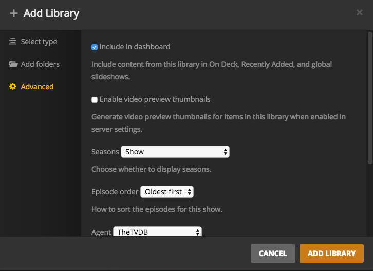 1. Click the Settings icon (top right) → "Server" (top) → "Library" (left). Click "SHOW ADVANCED" in the upper right.